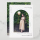 Cette élégante carte de faire-part de graduation botanique blanc et argent en feuille réelle comprend une arche photo avant avec cadre argent feuilleté, et une photo pleine arrière de la carte.