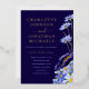 Celebrate your special day with this beautiful blue and gold floral watercolor wedding invitation, perfect for spring and summer weddings. Featuring hand-painted wildflowers and delicate foliage in harmonious shades of cornflower blue, navy blue, green, and soft purple, this design is set against a rich navy blue background for a luxurious, timeless feel. Subtle gold foil accents add an extra touch of elegance and sophistication.