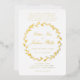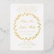 Une faire-part de mariage traditionnelle et élégante de courroie à branche d'olivier avec une couronne à branche d'olivier GOLD FOIL avec vos prénoms et vos médiums dans un script mariage classique, centré dans la couronne à FOIL OR. Vos noms apparaissent au verso dans une petite couronne avec l'adresse du lieu. Seule la couverture frontale de cet invitation est en GOLD FOIL.