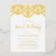 Invitation votre invité à votre événement avec cette feuille d'or personnalisable estampillée douce invitation de 16 parties. Il dispose d'élégantes dentelles de brocart botanique et de calligraphie géologique. Personnalisez cette élégante invitation de sweet sixteen en ajoutant des noms, date, heure, lieu et autres détails. Cette invitation en dentelle dorée est parfaite pour tous les thèmes de fêtes d'anniversaire.