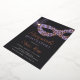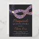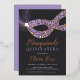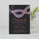 Les élégantes invitations à la boule de mascarade pour votre célébration de la quinceanera comprennent un masque orné en feuille d'or violet orchidée et rose sur un riche arrière - plan noir de charbon de bois, orné d'une plume. Personnalisez avec les détails de votre fête sous le script de calligraphie et de bloc de lettres.