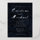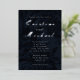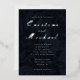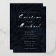 Elégante faire-part de mariage marine bleu foncé, avec un agencement fleuri vintage. Le script du couple mariage en papier argenté.