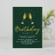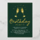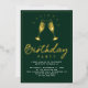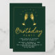 Invitations de fête d'anniversaire vert foncé et or avec deux verres de champagne torréfaction et "anniversaire" dans une police de texte de brosse. Le texte de "fête d'anniversaire" et les verres de champagne apparaîtront en papier métallique, tandis que les détails de l'événement sont écrits en texte blanc mat pour être facilement lisibles. Des invitations simples et amusantes pour des fêtes d'anniversaire pour adultes qui peuvent être changées à n'importe quel âge. Santé!