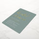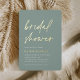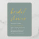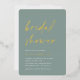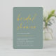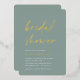 Invités Invitations pour célébrer la mariée d'être avec ces invitations de douche nuptiale modernes et minimes avec de magnifiques accents de feuille d'or. Le design simple comprend une "douche nuptiale" en décontracté écriture manuscrite sur un arrière - plan vert eucalyptus doux, avec les détails de votre événement aligné en bas à gauche en lettres blanches modernes.