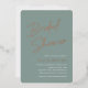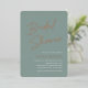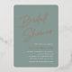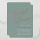 Invités Invitations pour célébrer la mariée d'être avec ces invitations de douche nuptiale modernes et minimes avec d'étonnants accents roses en feuille d'or. Le design simple comprend une "douche nuptiale" en décontracté écriture manuscrite, avec les détails de votre événement alignés à droite en lettres blanches modernes sur un arrière - plan vert eucalyptus doux.