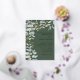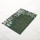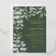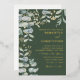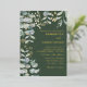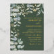 Faire-part de mariage magnifique et sophistiqué, avec des aquarelles originales d'eucalyptus et feuillage dans les tons vert sauge et bleu poussiéreux disposés sur un arrière - plan vert sauge foncé avec de véritables plaques d'or en feuille et texte. Customisez facilement.