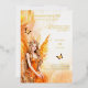 Un imprimé de papier à papier vif (choisir entre or, or rose ou argent) repose contre un arrière - plan plein de fumée blanche et orange. Une fée d'or et d'orange exquise avec ses ailes larges ouvertes est assise dans le coin inférieur gauche et a deux petits papillons dorés qui la entourent. Elle semble briller et briller et a de longs cheveux blonds qui se glissent sur son épaule. Le dos a la même conception et un seul modèle pour un libellé supplémentaire, si nécessaire. Dans le cas contraire, effacez simplement le modèle pour ne laisser que le graphique. Idéal pour un anniversaire "à thème de fée", une douche de mariée de conte de fées ou une fête d'anniversaire enchanteresse folk dames.
