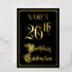 Le recto de ce design de carte d'invitation luxueuse et élégante pour un vingt-sixième anniversaire en papier métallisé comporte le message « Célébration de votre 26ème anniversaire » dans un texte de style calligraphié orné. Il comporte également un nom personnalisé. Le fond du recto est noir par défaut (bien qu'il puisse être personnalisé avec une couleur différente). Le verso comporte des détails personnalisés sur l'événement, tels que la date, l'heure, le lieu et toute autre information pertinente. Des invitations ornées, somptueuses et modifiables comme celles-ci pourraient être utilisées pour inviter des invités à une fête/une célébration d'anniversaire organisée pour célébrer le vingt-sixième anniversaire de quelqu'un.