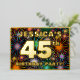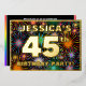 Le devant de ce modèle de carte d'invitation en papier métallisé pour une fête/une célébration d'anniversaire de quarante-cinq ans accrocheur et excitant comporte un nom personnalisable, un grand nombre « 45e », le message « FÊTE D'ANNIVERSAIRE ! » et une bordure. Le fond de la face avant présente un motif multicolore joyeux inspiré de feux d'artifice de célébration qui éclatent. Le verso comporte des détails personnalisés sur l'événement, tels que la date, l'heure, le lieu et toute autre information importante. Des invitations personnalisées comme celles-ci pourraient être une façon amusante d'inviter les participants à une fête/une réunion d'anniversaire organisée pour célébrer les 45 ans de quelqu'un. [~Z0000602]