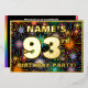 Le devant de ce design de carte d'invitation en feuille pour un quatre-vingt-treizième anniversaire audacieux et joyeux comporte un nom modifiable, un grand nombre « 93ème », le message « FÊTE D'ANNIVERSAIRE ! » et une bordure. Le fond de la face avant présente un motif coloré accrocheur qui ressemble à des feux d'artifice de célébration qui éclatent. Le verso comporte des détails personnalisés sur l'événement, tels que la date, l'heure, le lieu/endroit et toute autre information pertinente. Des invitations personnalisables comme celles-ci pourraient être une façon amusante d'inviter les participants à une fête/une réunion d'anniversaire organisée pour célébrer les 93 ans de quelqu'un.