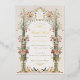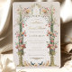 Entrez dans un jardin enchanté avec cette délicieuse invitation à la douche nuptiale, parfaite pour célébrer les noces de la future mariée. L'avant de l'invitation est orné d'une floraison d'art botanique, avec des fleurs aux teintes douces de pêche, de corail, de rose rousse et de vert sauge, nichées contre un arrière - plan en ivoire. Une urne classique déborde avec l'arrangement floral, tandis que des paons délicats ajoutent un air de charme royal. Des accents dorés et une calligraphie élégante rehaussent l'ambiance vintage de ce bel invitation. L'arrière de l'invitation est tout aussi étonnant, avec une motif géométrique crème et or sophistiquée qui respire une élégance intemporelle. Cette invitation est un beau prélude à un mariage plein de romantisme et de beauté.