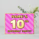 La façade de cette joyeuse carte d'invitation de fête de dixième anniversaire comporte un nom personnalisé, un grand numéro "10e", le message "FÊTE D'ANNIVERSAIRE !", et une frontière. L'arrière - plan de l'avant a un amusant motif rayé rose clair et rose foncé contenant des formes cardiaques. Le verso présente des détails personnalisés sur l'événement, tels que la date, l'heure, le lieu et toute autre information pertinente. Des invitations personnalisables comme celles-ci pourraient être une façon amusante pour les participants/invités invitations à une fête d’anniversaire ou à une réunion organisée pour célébrer le 10e anniversaire de quelqu’un. [~Z0000603]