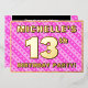 La façade de cette carte d'invitation joyeuse et amusante fêtée à l'occasion du 13e anniversaire/fête comporte un nom personnalisé, un grand numéro "13e", le message "FÊTE D'ANNIVERSAIRE !", et une frontière. L'arrière - plan de l'avant est doté d'un motif à rayures rose foncé et rose clair, optimiste, aux formes cardiaques. Le verso présente des détails personnalisés sur l'événement, tels que la date, l'heure, l'emplacement et toute autre information importante. Des invitations personnalisables comme celles-ci pourraient être une façon amusante pour les invités invitations à une fête d’anniversaire qui se tient pour célébrer le 13e anniversaire de quelqu’un. [~Z0000603]