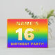 La façade de cette amusante carte d'invitation pour fêtes de seizième anniversaire comporte un nom modifiable, un grand numéro "16e", le message "FÊTE D'ANNIVERSAIRE !", et une frontière. L'arrière - plan du devant a un motif de dégradé optimisé, coloré et inspiré du spectre arc-en-ciel. Le verso présente des détails personnalisés sur l'événement, tels que la date, l'heure, le lieu/lieu et toute autre information qui peut être importante. Des invitations personnalisées comme celles-ci pourraient être une façon amusante pour les invités invitations à une fête d’anniversaire ou à une réunion qui se tient pour honorer le 16e anniversaire de quelqu’un. [~Z0000599]