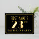 La façade de cette invitation de foil de fête des Années folles a inspiré vingt-troisième anniversaire avec un nom personnalisé, un grand style art déco inspiré numéro "23ème", le message "Fête des Anniversaires", et un motif frontalier composé de lignes. Il y a un arrière - plan de couleur noire sur le devant par défaut, mais il peut être customisé à une couleur différente si désiré. Le verso présente des détails personnalisés sur l'événement, tels que la date, l'heure, le lieu et toute autre information importante. Des invitations luxueuses, élégantes et customisées comme celles-ci peuvent être utilisées pour des invités invitations à une fête d’anniversaire ou à une réunion organisée pour honorer le 23e anniversaire de quelqu’un. [~Z0000591]