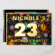 La façade de cette carte d'invitation pour fêter et fêter le vingt-troisième anniversaire avec un nom personnalisable, un grand numéro "23ème", le message "FÊTE D'ANNIVERSAIRE !", et une frontière. L'arrière - plan du front a un motif vibrant et multicolore, inspiré par les feux d'artifice, qui brille par son éclat. Le verso présente des détails personnalisés sur l'événement, tels que la date, l'heure, le lieu et toute autre information pertinente. Des invitations modifiables comme celles-ci pourraient être une façon amusante pour les invités invitations à une fête d’anniversaire qui se tient pour célébrer le 23e anniversaire de quelqu’un. [~Z0000602]