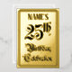 Le recto de cette conception élaborée de cartes de faire-part et d'invitation pour fêter et fêter le vingt-cinquième anniversaire comprend le message "Fête du 25e anniversaire" dans un élégant texte de style script. Il comporte également un nom personnalisable. Le verso présente des détails personnalisés sur l'événement, tels que la date, l'heure, le lieu et toute autre information qui peut être importante. Des invitations ornées, opulentes et modifiables comme celles-ci pourraient être utilisées pour les invités invitations à une fête d’anniversaire qui se tient pour célébrer le vingt-cinquième anniversaire de quelqu’un. [~Z0000596]