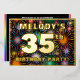 La façade de cette dynamique carte d'invitation de fête/fête de trente-cinquième anniversaire comporte un nom modifiable, un grand numéro "35e", le message "FÊTE D'ANNIVERSAIRE !", et une frontière. L'arrière - plan du devant a un motif coloré qui attire l'oeil et ressemble à un feu d'artifice de fête. Le verso présente des détails personnalisés sur l'événement, tels que la date, l'heure, le lieu et toute autre information pertinente. Des invitations personnalisables comme celles-ci pourraient être une façon amusante pour les participants/invités invitations à une fête d’anniversaire organisée pour célébrer le 35e anniversaire de quelqu’un. [~Z0000602]