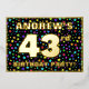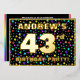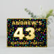 La façade de cette carte d'invitation à fêter le quarante-troisième anniversaire et à fêtes porte un nom personnalisé, un grand numéro "43e", le message "FÊTE D'ANNIVERSAIRE !", et une frontière. L'arrière - plan du devant a un motif étoilé multicolore accrocheur. Le verso présente des détails personnalisés sur l'événement, tels que la date, l'heure, le lieu et toute autre information pertinente. Des invitations customisées comme celles-ci pourraient être une façon amusante pour les invités invitations d’une fête d’anniversaire organisée pour célébrer le 43e anniversaire de quelqu’un. [~Z0000600]