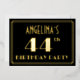 L'avant de cette invitation à fêter quarante-quatrième anniversaire de style années 1920/1930, d'inspiration vintage et à l'air , comporte un nom modifiable, un grand look art déco inspiré du numéro "44th", le message "BIRTHDAY PARTY", et un motif frontalier composé de lignes. L'avant dispose également d'un arrière - plan de couleur noire par défaut, mais il peut être customisé à une couleur différente si désiré. Le verso présente des détails personnalisés sur l'événement, tels que la date, l'heure, le lieu et toute autre information importante. Des invitations élégantes, luxueuses et modifiables comme celles-ci pourraient être utilisées pour les invités invitations à une fête d’anniversaire qui se tient pour honorer le 44e anniversaire de quelqu’un. [~Z0000591]