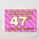 La façade de cette amusante carte d'invitation fêtée/fête de quarante-septième anniversaire comporte un nom modifiable, un grand numéro "47e", le message "FÊTE D'ANNIVERSAIRE !", et une frontière. L'arrière - plan de l'avant a un motif rayé rose foncé et rose clair aimant, aux formes cardiaques. Le verso présente des détails personnalisés sur l'événement, tels que la date, l'heure, le lieu/lieu et toute autre information qui peut être importante. Des invitations customisées comme celles-ci pourraient être une façon amusante pour les participants invitations à un rassemblement d’anniversaire organisé pour honorer le 47e anniversaire de quelqu’un. [~Z0000603]