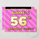 La façade de cette joyeuse carte d'invitation pour fêtes et célébrations de cinquante-sixième anniversaire comporte un nom personnalisé, un grand numéro "56e", le message "FÊTE D'ANNIVERSAIRE !", et une frontière. L'arrière - plan de l'avant a un motif aimant avec des rayures rose clair et rose foncé et des formes cardiaques. Le verso présente des détails personnalisés sur l'événement, tels que la date, l'heure, le lieu/lieu et toute autre information pertinente. Des invitations personnalisées comme celles-ci pourraient être une façon amusante pour les participants invitations à un rassemblement d’anniversaire organisé pour célébrer le 56e anniversaire de quelqu’un. [~Z0000603]