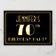 La façade de cette invitation à fêter l'anniversaire de la fête de style vintage de soixante-dixième est ornée d'un nom personnalisable, d'un grand style art déco inspiré du numéro "70e", du message "FÊTE D'ANNIVERSAIRE" et d'un motif frontalier composé de lignes. L'avant a également un arrière - plan de couleur noire par défaut, mais il peut être customisé à une couleur différente si désiré. Le verso présente des détails personnalisés sur l'événement, tels que la date, l'heure, le lieu et toute autre information importante. Des invitations élégantes, luxueuses et customisées comme celles-ci pourraient être utilisées pour les invités invitations à une fête d’anniversaire ou à une réunion organisée pour célébrer le 70e anniversaire de quelqu’un. [~Z0000591]