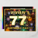 La façade de cette joyeuse carte d'invitation de soixante-dix-septième anniversaire comporte un nom personnalisé, un grand numéro "77e", le message "FÊTE D'ANNIVERSAIRE !", et une frontière. L'arrière - plan du devant présente un motif amusant et multicolore qui s'éclate autour d'un feu d'artifice. Le verso présente des détails personnalisés sur l'événement, tels que la date, l'heure, l'emplacement/le lieu et toute autre information pertinente. Des invitations customisées comme celles-ci pourraient être une façon amusante pour les participants/invités invitations à une fête d’anniversaire ou à une réunion qui a lieu pour célébrer le 77e anniversaire de quelqu’un. [~Z0000602]