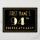 L'avant de cette vintage apparition de quatre-vingt-quatorze ans fêté/foil de fête comporte un nom modifiable, un grand look art déco inspiré du numéro "94th", le message "BIRTHDAY PARTY", et un motif frontalier composé de lignes. L'avant dispose également d'un arrière - plan de couleur noire par défaut, mais il peut être customisé à une couleur différente si désiré. Le verso présente des détails personnalisés sur l'événement, tels que la date, l'heure, le lieu et toute autre information importante. Des invitations luxueuses, élégantes et customisées comme celles-ci pourraient être utilisées pour des invités invitations à un rassemblement d’anniversaire qui se tient pour célébrer le 94e anniversaire de quelqu’un. [~Z0000591]