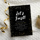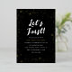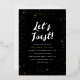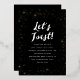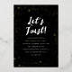 Donnez le ton de votre célébration grâce à ces invitations à la fête de la Saint-Sylvestre modernes, avec l'expression "Let's Toast!" dans une police de caractères élégante blanche. Une bordure chatoyante d'étoiles en feuille d'or sur un arrière - plan noir élégant ajoute une touche d'élégance et de festivité. Personnalisez ces invitations au réveillon du Nouvel An en papier doré avec vos détails de fête pour créer une façon étonnante et customisée pour les invités invitations à votre célébration de fin d'année. Idéal pour accueillir un rendez-vous chic et inoubliable du Nouvel An.