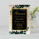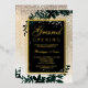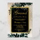 Une typographie moderne, chic et élégante en feuille d'or véritable aquarelle vert floral Grand Ouverture de Noël invitation avec feuillage en feuille d'aquarelle vert peint à la main sur un dégradé d'or jaune chic avec neige blanche et flocons de neige.