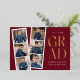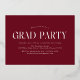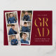 Invitations branchés de la fête de remise des diplômes avec une bande de film avec 6 photos carrés du diplômé. "Grad" est affiché en papier doré moderne avec un arrière - plan bordeaux. Personnalisez le devant de l'invitation de la fête de graduation multiphoto en ajoutant le nom du diplômé, le nom de l'école et l'année de graduation. L'invitation inverse pour afficher les détails de votre fête de remise de diplômes en lettres blanches avec un arrière - plan bordeaux. L'invitation de la fête de fin d'études est parfait pour les diplômés du secondaire et du collège.