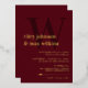 Élégante typographie faire-part de mariage en Bourgogne avec votre initiale bientôt partagée dans une ombre plus sombre de vin rouge sous vos noms en feuille d'or. Ajoutez les noms et le libellé mariage dans le papier doré. Feuille d'or et faire-part de mariage rouge foncé avec vos noms dans une grande police et votre monogramme en rouge foncé sous le texte. Un détail de flèche en feuille d'or.