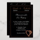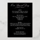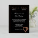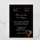 Il s'agit d'un faire-part de mariage de 5' x 7'', montré en noir élégant, avec des accents roses en feuille d'or. Il s'agit d'une véritable garniture en feuille, disponible en or, argent et or rose. Les accents de feuille comprennent le nom de la mariée et du marié, un coeur fantaisiste et une ligne horizontale, un design de coeur et de rose, et un contour de feuille sur l'avant. l'arrière comprend un motif "Notre journée spéciale", avec des détails sur le mariage.