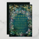 Une aquarelle fantaisie illustrant le feuillage luxuriant vert émeraude et mauve et violet, brillant de lumières féeriques et de poussière magique, orne cet automne d'été Sweet 16 invitation avec un thème de forêt enchanté qui comprend également un cadre de roses délicats en rose, violet et mauve. Le texte, ainsi que les lumières, ont été produits avec de la vraie feuille d'or. Une invitation élégante et moderne pour un conte de fées seizième anniversaire. Parfait pour les filles et les familles qui aiment le cadre de la forêt de contes de fées, la forêt de fées ou le thème du jardin de fées et vert émeraude, mauve et or.
