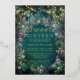 Une aquarelle fantaisie illustrant le feuillage luxuriant vert émeraude et mauve et violet, brillant de lumières féeriques et de poussière magique, orne cet automne d'été Sweet 16 invitation avec un thème de forêt enchanté qui comprend également un cadre de roses délicats en rose, violet et mauve. Le texte, ainsi que les lumières, ont été produits avec de la vraie feuille d'or. Une invitation élégante et moderne pour un conte de fées seizième anniversaire. Parfait pour les filles et les familles qui aiment le cadre de la forêt de contes de fées, la forêt de fées ou le thème du jardin de fées et vert émeraude, mauve et or.