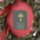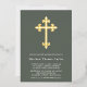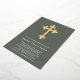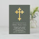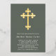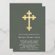 Invitation de baptême personnalisable avec une croix d'or sur un arrière - plan vert de forêt.