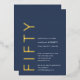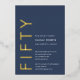 Gold Foil and navy blue and white Fifty and Fabulous Modern Minimal 50th birthday invitation that you can personalize and send out for your fiftieth birthday party celebration. The words are set using timeless and trending bold font typography. Text and background colors can be changed using the edit menu.