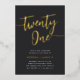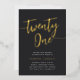 Célébrez son anniversaire d'étape avec ces invitations chic à la fête de 21e anniversaire avec "vingt et un" en écriture manuscrite en feuille d'or moderne. Personnalisez avec les détails de votre fête en dessous. Un choix inoubliable et luxueux pour fabuleuses fêtes du 21e anniversaire.