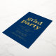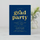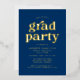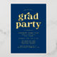 Invitations élégants de la fête de remise de diplômes avec "grad party" affiché en gras feuille d'or avec le nom du diplômé et les détails de la fête indiqués ci-dessous sur un arrière - plan bleu. L'arrière de l'invitation de la fête de graduation bleu et or présente la photo verticale du diplômé. Les simples invitations de la fête de fin d'études sont parfaits pour les diplômés du secondaire et du collège.