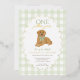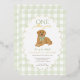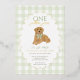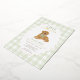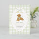Célébrez le premier anniversaire de votre petite fille avec cette ravissante invitation "Une année d’or" qui comprend un adorable chiot de repérage d’or portant un arc en vichy vert. L'arrière - plan présente une bordure en vichy vert pâle douce à damiers avec un cadre à pétoncles dépoli, parfait pour une fête d'anniversaire. Entièrement personnalisable avec le nom de votre enfant, les détails de la fête et les informations RSVP.