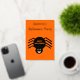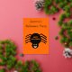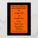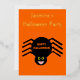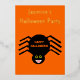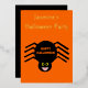 Cette belle feuille d'invitation de la fête d'Halloween présente une araignée noire éffrayante avec huit jambes poilues, des yeux jaunes avec de grands élèves noirs et sa bouche ouverte montrant ses crocs. Il y a un texte orange qui dit "Happy Halloween" et un arrière - plan orange correspondant. Le texte personnalisé sur le devant est en belle feuille d'or. Il y a du texte supplémentaire à l'arrière pour que vous puissiez inclure tous les détails.