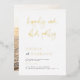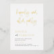 Ajoutez un peu de brillance à votre annonce de mariage moderne et minime et invitations à la réception avec de l'or, de l'argent ou de l'or rose réels ! Ce style métallique classique et intemporel ajoutera un autre niveau à vos convives. La face avant de cette carte présente "joyeusement toujours après la fête" dans le script de calligraphie chic de vrai feuille de papier, avec les noms du couple et les détails de célébration alignés à gauche ci-dessous. Une simple invitation de mariage en noir et blanc détaillée avec une véritable feuille de typographie élégante. Le revers des cartes a une photo à fond, avec les noms du couple en caractères gras serif et leur date de mariage ci-dessous. Le libellé peut être modifié pour une cérémonie de renouvellement de voeu, un mariage de suite, un anniversaire, un après-elopement ou un dîner. Parfait pour les couples qui ont fui, ont eu une petite cérémonie privée ou micro mariage, mais veulent toujours célébrer avec la famille et les amis. Vous pouvez facilement choisir entre l'or, l'argent et la feuille d'or rose de l'outil ci-dessus. Voir la collection liée sur cette page pour les objets correspondants ou visitez notre magasin pour plus de modèles d'invitation de mariage!