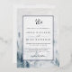Élégante invitation de mariage hivernal, un arrière - plan d'aquarelle représentant un paysage de montagne enneigé parsemé de pins dans les nuances brumeuses de bleu et de gris. Personnalisez avec vos détails mariages en lettrage doux et doux, surmonté de votre monogramme ou de votre duogramme, accompagné d'un esperluette décoratif. Un beau choix pour des mariages d'hiver élégants en montagne ou en forêt. La garniture en feuille d'argent complète le design pour un look luxueux.