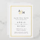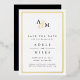 Simples et élégants enregistrer les cartes de dates avertir vos invités de votre prochain mariage dans un style intemporel. Les cartes en noir et blanc crampé avec des accents de feuille d'or présentent vos initiales travaillées dans un monogramme, jointes par un script de calligraphie d'esperluette. "Enregistrer la date" apparaît sous, avec vos noms, date mariage et emplacement sous.
