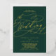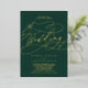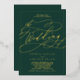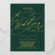 Ce faire-part de mariage romantique en feuille d'or émeraude est parfait pour un simple mariage. Le design classique moderne comprend des tourbillons fantaisistes et des fleurs fantaisistes avec une superbe élégante typographie estampillée feuille or lettrée à la main et un cadre de feuille formelle sur un arrière - plan vert émeraude foncé.