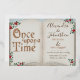 Ce magique et enchanteur économiser pour la faire-part de mariage dispose d'un thème conte de fées livre d'histoire. L'arrière - plan est un livre ouvert de style vintage avec des accents de parties scintillant autour de la frontière. L'expression de conte de fées "Il était une fois" est imprimée sur la page de gauche dans une police de papier or fantaisiste et réelle. Les noms du couple nouvellement engagé sont imprimés à droite, ainsi que la date du mariage et le texte supplémentaire que vous pouvez personnaliser avec votre propre nom. Des roses et des vignes rouges enchâssées sont placées dans les coins du livre.