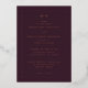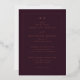 Cette élégante invitation de mariage présente un fond bordeaux profond avec un texte doré, créant un look luxueux et sophistiqué. La mise en page est centrée et symétrique, avec des initiales grasses en haut suivies d'un mélange de polices serif qui ajoutent de la formalité et du charme. Le design met l'accent sur la clarté et l'élégance, ce qui le rend parfait pour une célébration de mariage traditionnelle et raffinée. Sa riche palette de couleurs et sa typographie classique transmettent une atmosphère d'anticipation et de joie, idéale pour marquer cet événement important de la vie.