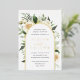 Notre faire-part de mariage de fleurs d'ivoire entoure vos détails de mariage avec une arche gracieuse de verdure aquarelle peinte, feuilles d'eucalyptus, feuillage botanique et fleurs de roses et de pivoines blanches. La finition en feuille d'or et le lettrage d'accent ajoutent une finition luxueuse à ce magnifique design.