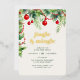 Le JIngle Mingle Festive Christmas Party présente un design en feuille d'or avec une guirlande couleur verte et des ornements rouges. Parfait pour votre fête de Noël de Noël. La feuille d'or semble la meilleure sur ce design.